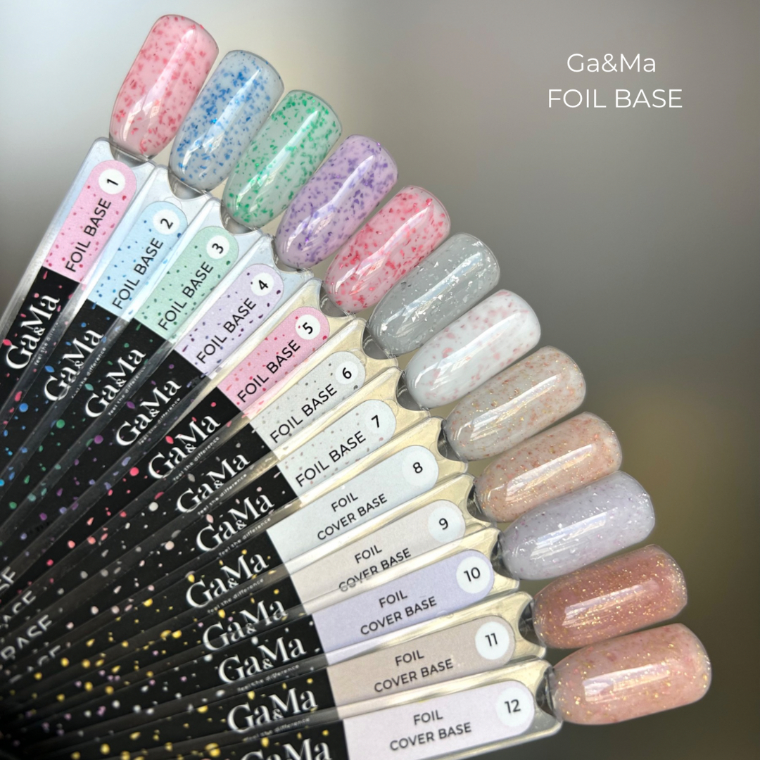 Foil Base GA&MA — колекція камуфлюючих баз з витонченими частинками фольги, які надають ніжного та водночас ефектного вигляду манікюру. Ідеальний вибір для клієнтів, які цінують стиль та елегантність.